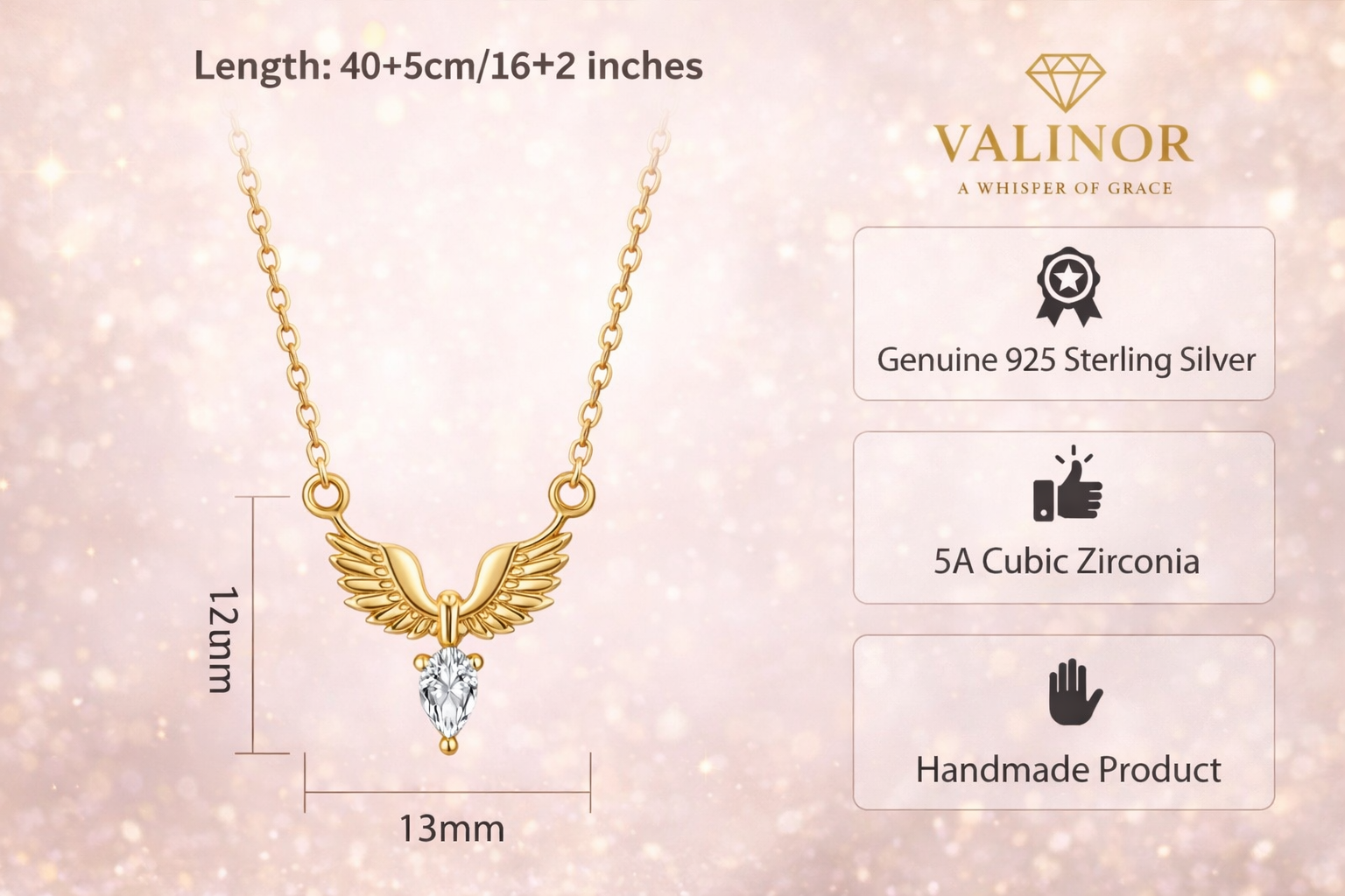 שרשרת Angel Wings בעיצוב ייחודי עם תליון כנפי מלאך ואבן נוצצת בתלייה עדינה, המוסיפה נוכחות אלגנטית ונשית.